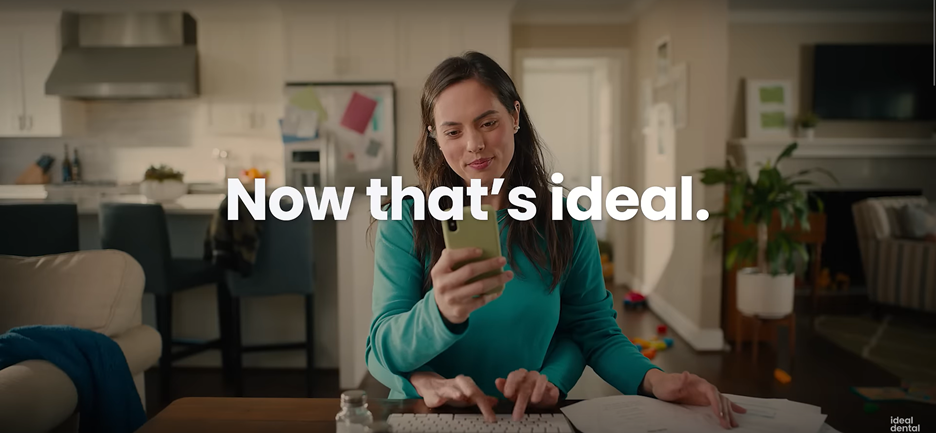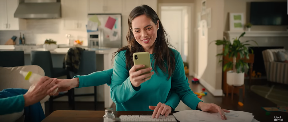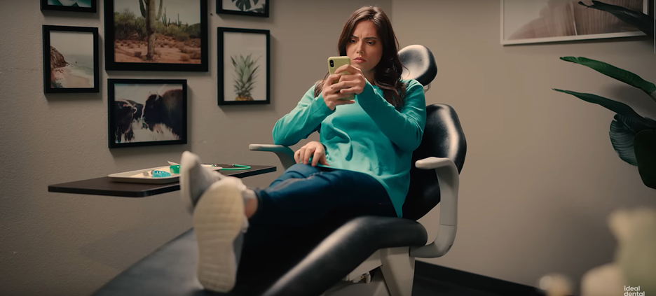 The main sell the advertisement is attempting to make is that Ideal Dental allows busy patients like Teal-shirt below to schedule their appointments on Saturdays. That’s it. No special mention of the quality of dentistry nor the kinds of services offered. Those parts are already coded in in the architype of the patient they present. Our unproblematic patient is (hyper)able-bodied, ostensibly middle/upper-class, and already dentally hygienic. That she’s white, young, a mother, and employed cannot go unmentioned.